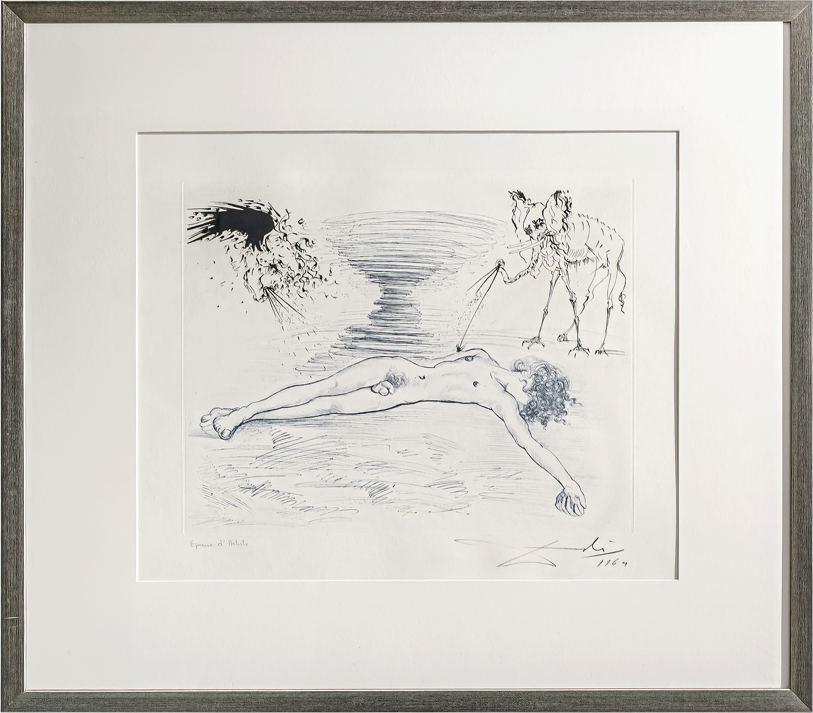 „Hypnos” w mitologii greckiej to bóg snu — syn nocy (Nyx) i brat Thanatosa (śmierci). Jego rola polegała na wprowadzaniu istot żywych w stan snu. Grafika ukazuje symboliczne pojawienie się Hypnosa w wizji surrealistycznej, typowej dla Dalego. W centralnej części kompozycji pojawia się zarys postaci ludzkiej – delikatny, niemal rozpływający się w przestrzeni. Ciało Hypnosa zdaje się unosić w powietrzu, jakby między jawą a snem. Jego sylwetka, otoczona mgłą tajemnicy, przyciąga wzrok i pobudza wyobraźnię, skłaniając do refleksji nad naturą snu, marzeń i ukrytych pragnień. Dali nie odtwarza mitycznej postaci w sposób realistyczny, zamiast tego ukazuje symboliczną esencję snu – jego ulotność, bezczasowość i granicę między świadomością a nieświadomością. Podczas gdy inne prace z tego cyklu – takie jak np. Edyp i Sfinks – ukazują dramatyczne konfrontacje, Hypnos reprezentuje ciszę, introspekcję i kontemplację To dzieło można uznać za wizualny odpowiednik stanu snu, w którym czas i przestrzeń przestają obowiązywać, a artysta – niczym Hypnos – wprowadza odbiorcę w świat nieświadomości i wizji.